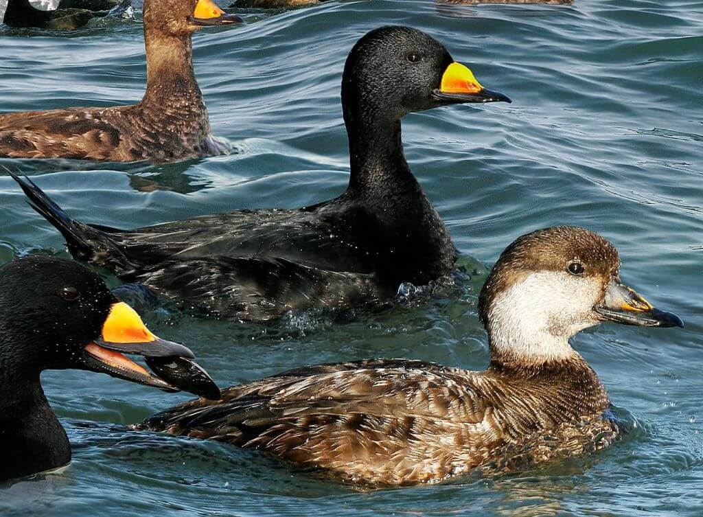Black Scoters produce distinct calls from those of the Common Scoter. The male’s call is a mellow whistling note, while females give rougher, lower sounds.