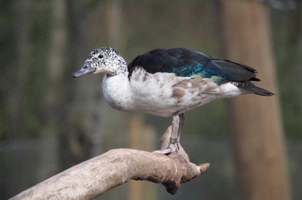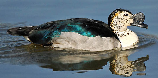A large and unmistakable duck with a white head covered in black speckles, a white neck and underparts, and glossy blue-black upperparts with green and blue iridescence on the wings. Males are larger and have a prominent black knob on the bill. Females are smaller with a reduced bump. Flanks are darker — black in males, medium grey in females. Juveniles may resemble fulvous whistling ducks from a distance but are usually accompanied by adults.
