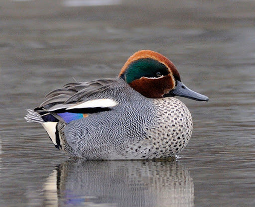 One of the smallest dabbling ducks. Males in breeding season have a chestnut head with a dark green eye patch edged in cream, a grey body, and a white stripe on the side. Females are mottled brown with a small green speculum on the wing and resemble a tiny female mallard. Both sexes have a green speculum that reflects in flight.