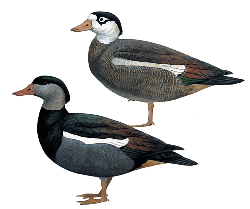 A medium to large duck with a long body and slender neck. Males have a greenish-black head, breast, wings, and tail, with a brownish-black face and throat. Their belly and flanks are dark grey with black streaks, and the upper wings show white with a green iridescent patch. Females have a white face, throat, and neck, a black crest, and a dark brown body with white streaks. Both sexes have a small green crest or tuft of feathers on the head. The bill and legs are pinkish, with males slightly brighter.