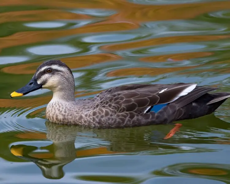 The spot-billed duck is a clever mix of patterns and colors, with a head that often appears black-and-white from a distance. The long neck and distinctive yellow spots at the base of the bill stand out against the lighter head, and white tertial stripes on the sides add to the contrast. When the duck takes flight, the blue speculum and broad white bands on the wings highlight its head markings, making it easier to identify among other waterfowl.