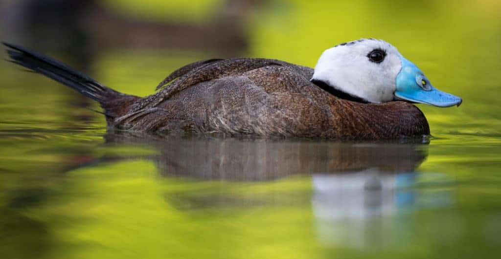The white-headed duck is a small diver with a head that can’t be missed. Males have a bright white head topped with a black cap and neck, paired with a blue bill that adds a splash of color. Females are less showy but still display a white face with darker cap and cheek markings. Their black-and-white head makes them easy to spot on calm lakes, especially as they dive and resurface in search of aquatic plants.