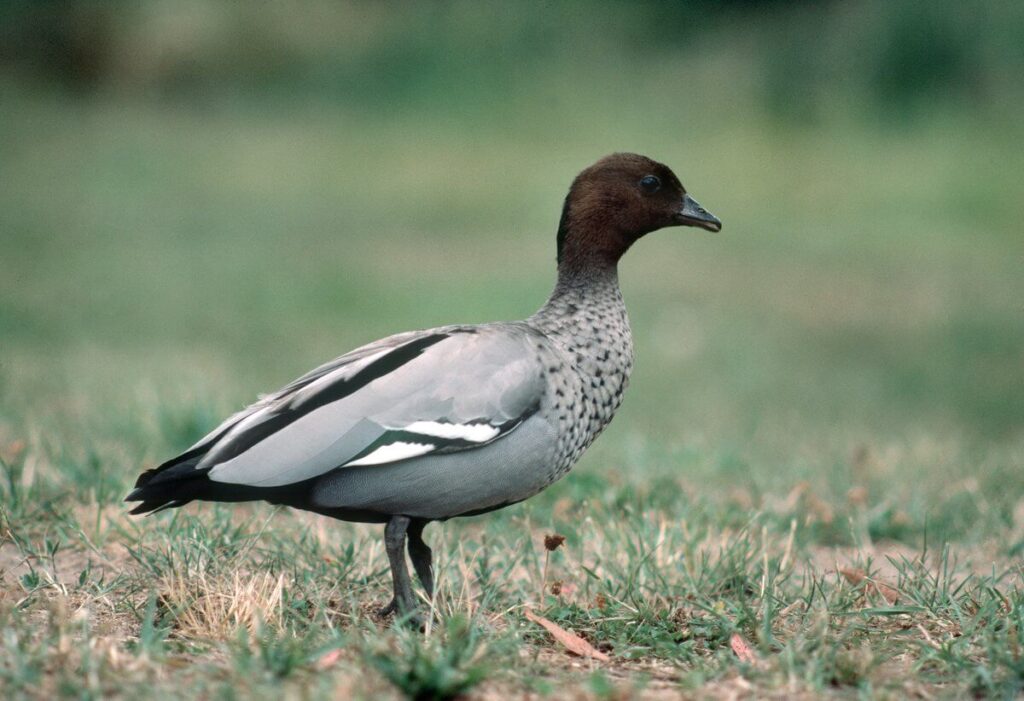 Also called the Australian Wood Duck, the Maned Duck is a graceful, upright bird often seen grazing on grass rather than dabbling in the water like most ducks. Both males and females have dark gray legs and black feet, which help them walk easily on land and perch on tree branches — something most ducks rarely do! The male has a chocolate-brown head and a soft gray body, while the female shows more patterns, with white eye stripes and spotted underparts. These ducks often nest in tree hollows and can be quite talkative, especially when perched high up.