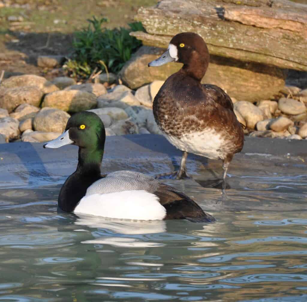 The Lesser Scaup looks very much like the Greater Scaup but is slightly smaller and has a purplish sheen on its head instead of green. Both species share dark, almost black feet, which they use to kick powerfully underwater while diving. Males wear black and white plumage with bright yellow eyes, and females are brown with a white face patch. They’re often found on lakes, ponds, and marshes, diving again and again in search of food.