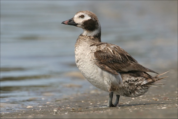 The Long-tailed Duck is a sea duck known for its elegant, slender tail feathers — especially in males. In winter, its plumage is mostly white with dark patches, while in summer, it turns browner. Its legs and feet are black, helping it paddle through icy northern seas. This duck dives deep under water to catch small shellfish and crustaceans, often disappearing completely below the surface. Those black feet act like strong paddles, built for life in the cold, choppy waves.