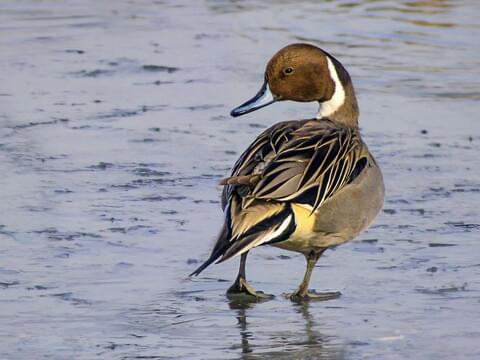 The Northern Pintail is a graceful, long-necked duck known for its elegant shape and pointed tail feathers. Males have a chocolate-brown head, a white stripe up the neck, and blue-grey legs and feet that appear almost dark in some lighting. Females are mottled brown with the same slender build and long greyish feet. Pintails walk well on land and swim effortlessly in shallow waters. Their sleek bodies and slightly forward-leaning swimming style make them easy to recognize — and those dark-toned feet are another good clue for birdwatchers watching them dabble or wade near the shore.