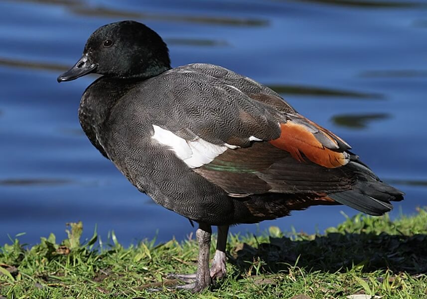 The Paradise Shelduck is a striking and large duck from New Zealand, known for its bold colors and black webbed feet. The male has a dark, blue-black head and neck, while the female stands out with a pure white head and rich chestnut body. Both have black legs and feet, perfect for swimming and walking across grassy wetlands. You’ll often see them in pairs — they mate for life and stay close together.
