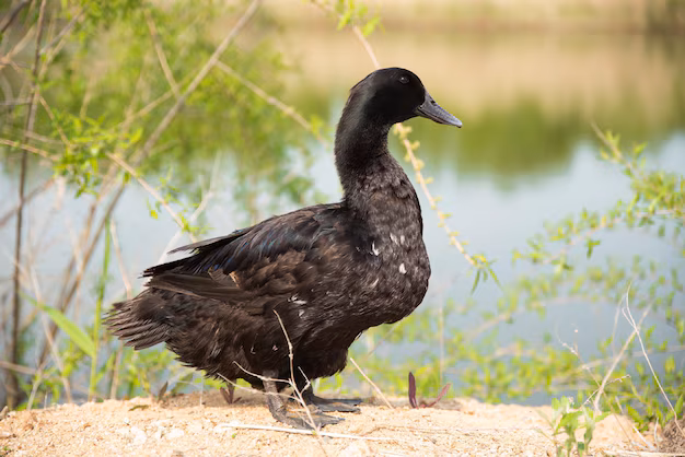 The Black East Indian Duck is small, elegant, and entirely dark — from its shimmering black feathers to its matching black feet and bill. In the sunlight, its plumage glows with hints of green and blue, giving it a jewel-like sheen. These ducks are often kept as ornamental birds, admired for their beauty and gentle temperament.