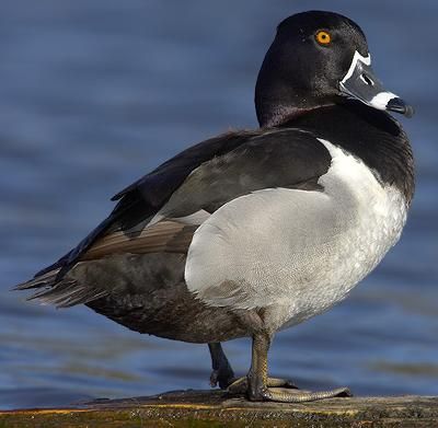 This duck’s name might trick you — it’s called the Ring-necked Duck, but the ring around its neck is hard to see! What’s easier to notice are its sharp black-and-white patterns and its dark feet. The male has a glossy black head and chest, a white belly, and two neat white rings around the bill. The female wears softer brown tones but shares those blackish-gray feet. You can often spot them in calm lakes or ponds, diving for seeds and aquatic plants.