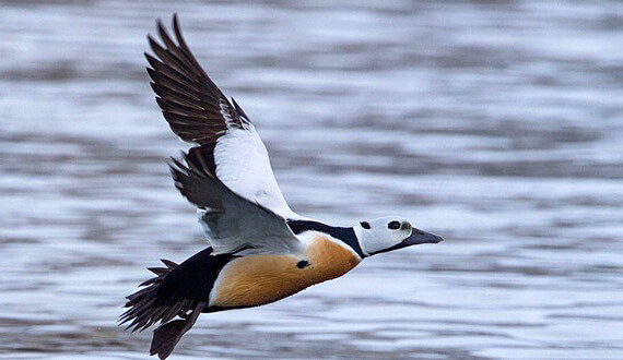 The Ruddy Shelduck is a large, brightly colored duck that’s easy to spot thanks to its glowing orange-brown body and creamy head. Both males and females have dark legs and black feet — a detail that’s useful when identifying them, especially when they’re resting near the water’s edge. Males show off a thin black collar around the neck, while females usually lack it and have a paler face. These ducks love open lakes and rivers and are often seen in pairs. When they take flight, their white wings flash brightly, contrasting beautifully with their dark feet below.