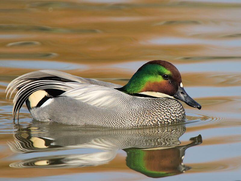 The Falcated Duck male’s head gleams with metallic green, while long, curved feathers sweep down his back like graceful blades — that’s where his name “falcated,” meaning “sickle-shaped,” comes from. His body is softly patterned with gray, white, and bronze tones, giving him a silky look. The female is more modest, dressed in shades of brown, but still easy to spot with her slender gray bill. These ducks prefer quiet wetlands and calm waters, where the males’ green heads flash in the sunlight as they glide together in pairs.