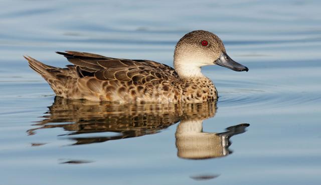 The Grey Teal may look plain at first, but its deep red eyes give it a lively, alert look. Those bright eyes stand out beautifully against its pale face and soft grey-brown feathers.