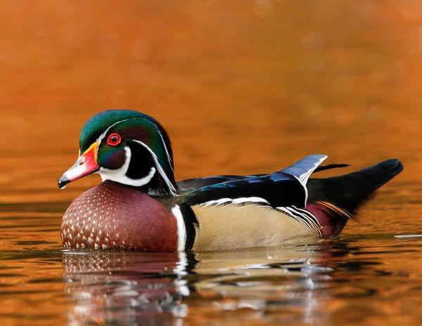 The Wood Duck is one of the most colorful ducks you’ll ever see, and its bright red eyes make it even more striking.