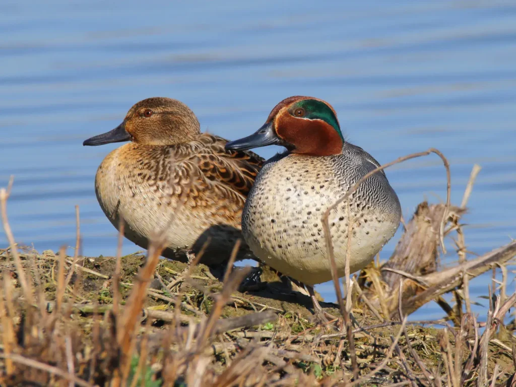 The Eurasian Teal is a tiny dabbling duck with a surprisingly colorful head. Breeding males have a rich chestnut head adorned with a dark green crescent-shaped patch near the eye, bordered by fine pale lines. This mix of red, green, and white makes them a delight to spot on northern European wetlands. Though small, they are strong migrators, flying south to warmer waters in Africa and southern Asia during winter.