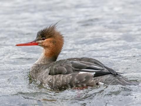 Females of the Common Merganser have a lovely rusty-cinnamon head that gives them a sleek and confident look—especially with that shaggy crest at the back. Their bodies are long and elegant, more streamlined than most ducks you might see. What really sets mergansers apart is their thin, narrow bill built for catching fish. These birds are strong swimmers and often cruise along rivers and lakes, diving suddenly to snatch their prey.