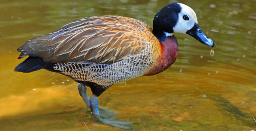 White-faced Whistling Ducks have a striking white face and upper neck that clearly contrasts with their dark crown and chestnut breast. They’re named for their distinctive high-pitched whistling calls, which you’ll often hear before you see them. Found in Africa and South America, these ducks gather in large flocks around wetlands and rice fields and are known for being especially social and vocal.