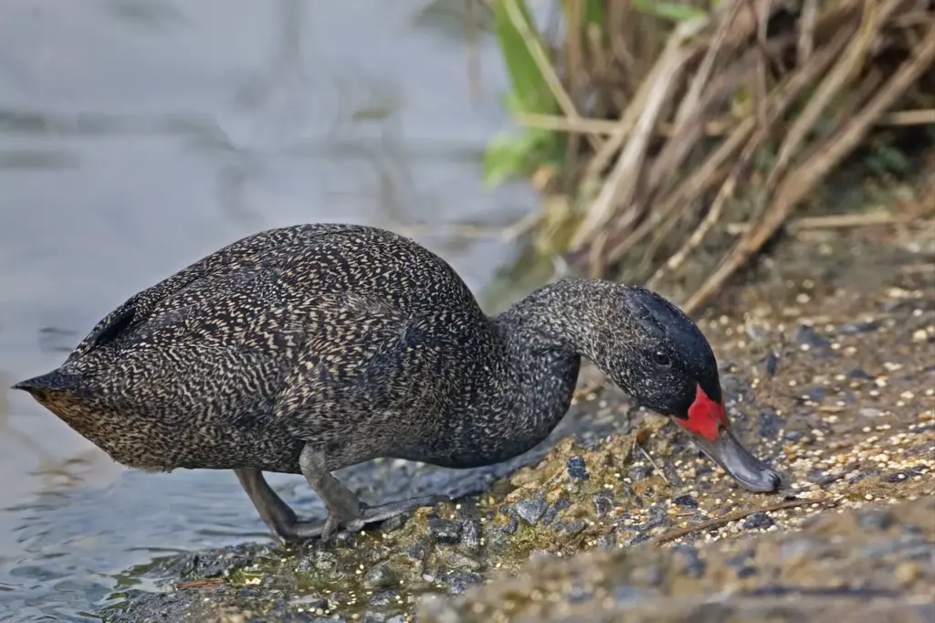 A medium-sized duck with dark grey to black plumage covered in fine white speckles, giving a ‘freckled’ appearance. Bill, legs and feet are slate grey. Males develop a reddish base to the bill (culmen) during breeding season; the deeper the red, the higher the dominance or breeding condition. Juveniles are pale grey and lack speckling until their first full moult at around 32 weeks.