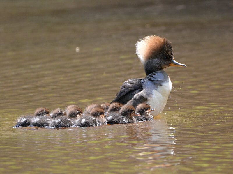Hooded Mergansers are cavity nesters, meaning they lay their eggs in tree holes or nest boxes near water. The female lays 7–15 eggs and begins incubating once all are laid. Males leave soon after, while the female cares for the eggs and ducklings alone. The chicks hatch all at once and jump from the nest within 24 hours, already able to swim and dive.