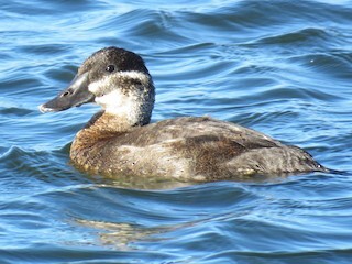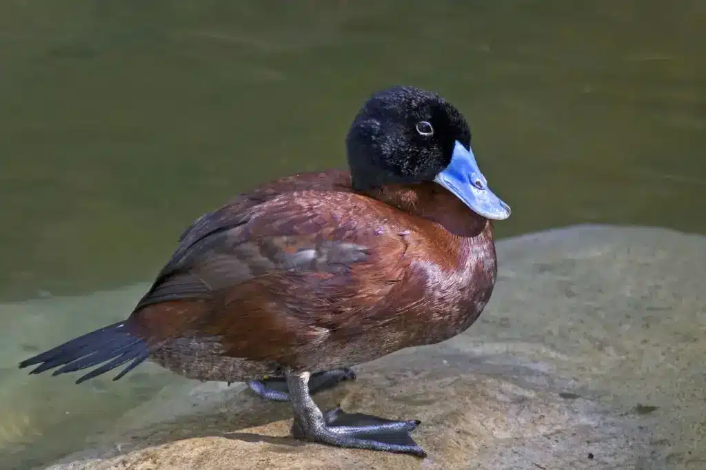A stiff-tailed diving duck with a distinctive cobalt blue bill in breeding males. Males have a black head and throat, chestnut body, and dark tail and feet. Females are duller, showing a greyish bill with a pale tip, light brown face, and dark crown and cheek stripe. Juveniles resemble females but with slimmer, notched tail feathers.