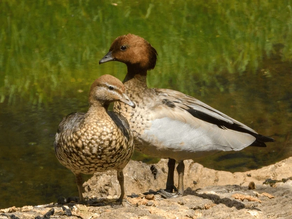 The Australian Wood Duck looks like a small goose. The male has a dark brown head, grey body, and fine black-and-white lines on the sides. The female is lighter, with white stripes above and below the eye and a mottled breast. Both have grey wings with a white patch and black tips. Juveniles look similar to females but are lighter in color.
