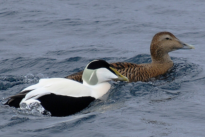 The Common Eider is a large, heavy sea duck with a wedge-shaped bill and low profile. Males have striking black-and-white plumage with a pale green nape, while females are mottled brown with a distinctive long head and sloping bill. The Northern Eider (borealis) differs subtly by showing small, ornate scapular “sails,” bright yellow-orange bills, and matching leg tones. Its bill is more elongated and drooping toward the tip compared to the nominate race.
