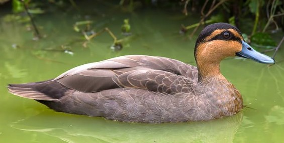 A large and striking dabbling duck with a bluish-grey bill that gives it a calm, graceful look. Its crown, nape, and eye stripe are black, contrasting beautifully with a warm cinnamon head and neck. The rest of its body is greyish brown, and the wings flash a bright green speculum in flight. Males and females look almost the same, though females are a bit smaller.