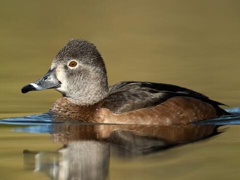 A small to medium-sized diving duck native to North America, most often found in freshwater ponds and lakes. It gets its name from a faint cinnamon-colored ring around the neck, though this marking is rarely visible in the field. The adult male has a glossy black head, back, and breast, contrasting with white sides and a striking two-ringed gray bill. Its golden-yellow eyes and angular head profile add to its sharp appearance. The female is brownish-gray with a darker crown, lighter flanks, and a white eye ring. Her bill is duller but retains a lighter band similar to the male’s.