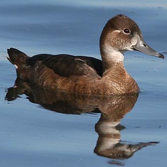Medium-sized diving duck. Males have a reddish eye and dark head, with pale brown body; females are duller with brown plumage. Both sexes have a compact body and rounded head.