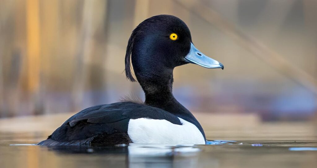 A compact diving duck known for its glossy dark plumage and distinctive tuft at the back of the head. Males are striking black-and-white birds with a purple sheen on the head, golden-yellow eyes, and a blue-grey bill. Females are chocolate-brown with paler flanks and may show a faint white patch at the base of the bill. The tuft and the contrasting colors make them easy to identify compared to scaups, which lack the head crest.