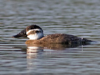 A small diving duck with a chunky body and stiff tail often held upright. The male is easy to recognize with his white head, black crown and neck, reddish-grey body, and bright blue bill. Females are more muted—brownish-grey with a pale face, darker cap, and a dark stripe across the cheek. Both sexes sit low in the water and often dive rather than fly when disturbed.