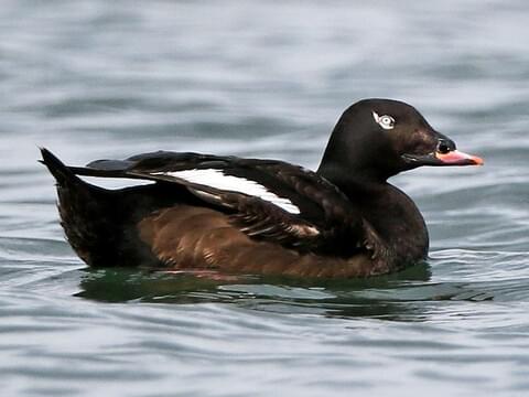 Adult males are mostly black with a bold white crescent around the eye and a white patch on the wings that gives the bird its name. Their bill is orange-red with a large black knob at the base. Females are chocolate brown with a variable facial pattern—some have white spots before and behind the eye, while others appear almost uniformly dark. The species’ “two-stepped” head profile and feathered gape help distinguish it from similar scoters.